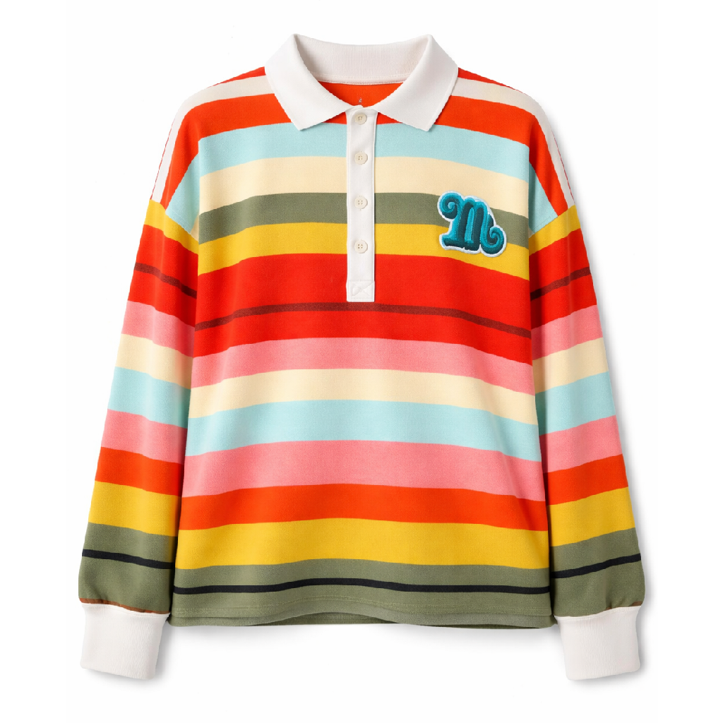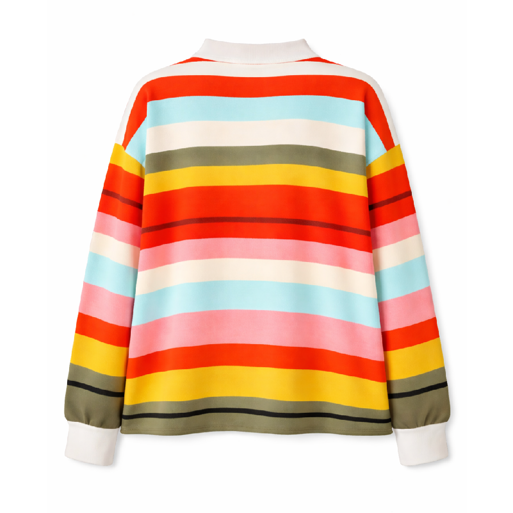 Packaging arrived neatly folded without wrinkles and the multicolor stripes look even more vibrant in person, giving the shirt a standout style that works casually or layered for a slightly dressed-up look. Quality stitching around the rib-knit cuffs feels durable and the half-button placket adds a nice structured detail that gives confidence this will last more than one season.