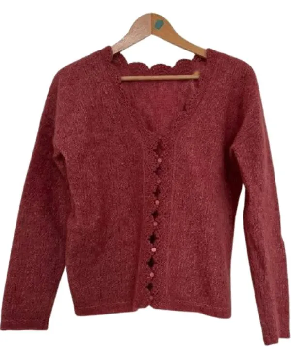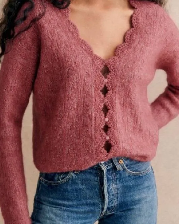 This pink cardigan is soft and stylish, perfect for adding warmth with a pop of color. The long sleeves and V-neck collar give it a classic, cozy feel. It’s great for casual