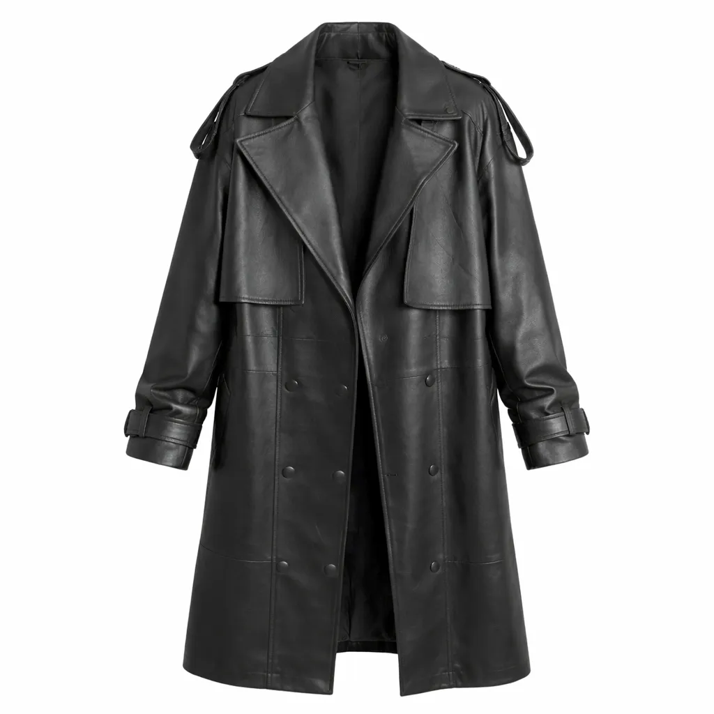 This Becky G Black Leather Trench Coat is made to give your outfit a dash of celebrity style. It is made from premium real and imitation leather and provides a smooth, polished appearance in addition to durability. Comfort is guaranteed by the soft viscose lining, which makes it ideal for all-day wear. With its sharp lapel collar and traditional buttoned front, the coat elevates any ensemble. You get both style and functionality with the full-length sleeves and two outside and one inside functional pockets. Because of its deep black hue, it goes well with both dressy and casual ensembles. This leather coat enhances your appearance while maintaining your comfort and self-assurance, whether you are going out for a night on the town or to a formal event.