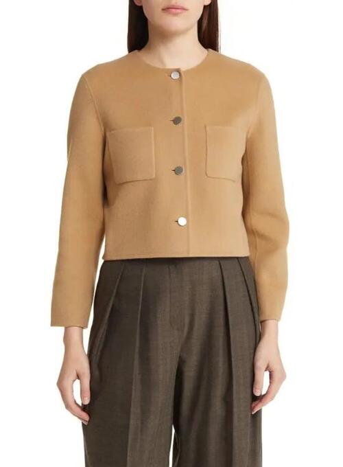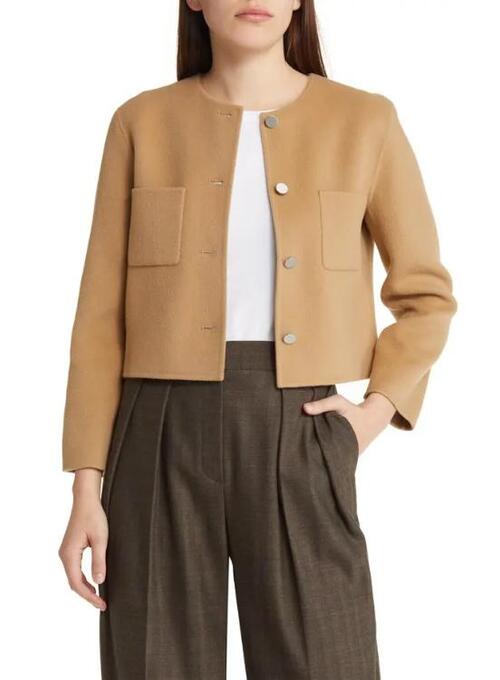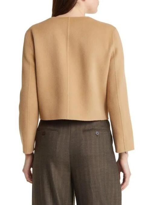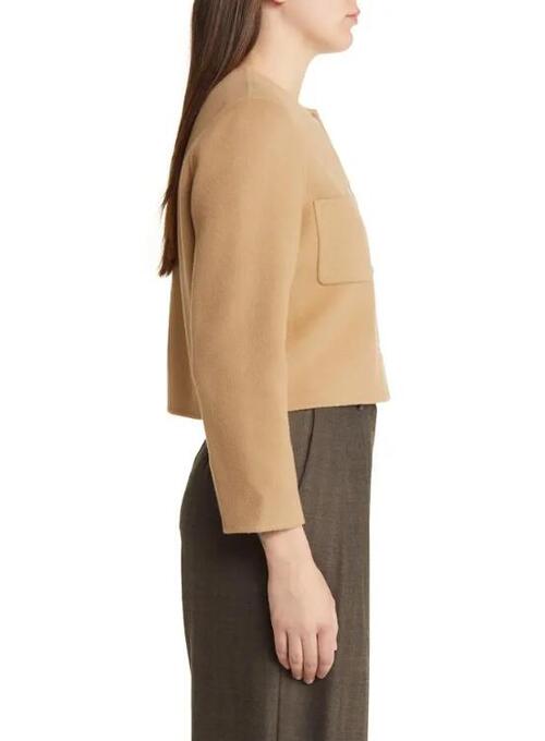 This cropped camel jacket has a sleek, contemporary design. The soft exterior provides a smooth texture, and the cropped design adds a fashionable touch. It has a standard fit that fits the body comfortably and is simple to wear. The camel is easy to coordinate with a range of ensembles because of its neutral color. For a polished and tidy look, it can be worn with jeans, skirts, or pants. This jacket is a great choice for casual outings and get-togethers because it blends comfort and style in one piece.