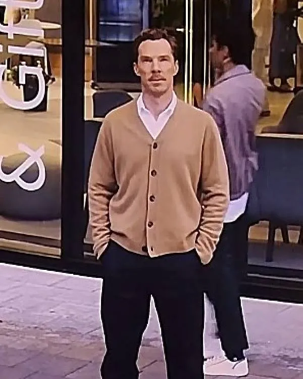 Knitted fabric is used to make the cardigan. It is incredibly comfortable to wear and feels smooth against the skin. A tidy button closure on the front makes it simple to open and close. Its V-neck collar gives it a neat and uncomplicated appearance. The long sleeves of the cardigan provide complete coverage and warmth. The rib-knitted cuffs maintain the sleeves’ shape and fit well around the wrists. The beige hue is gentle and goes well with jeans, pants, or even a shirt. This cardigan is ideal for going out on a cold day, lounging around the house, and wearing every day. Like Benedict Cumberbatch himself, it is a wonderful blend of coziness and understated style.