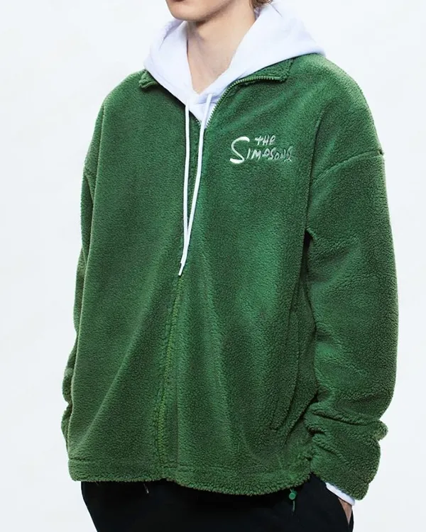 This Simpsons Green Wool Jacket is made of real wool fabric, which embodies toughness and vibrant style. In addition to a zipper-style closure for comfort and ease, its sleek design features a stand-up collar for a touch of refinement. With two foldable chest pockets and two waist pockets, the outfit boasts more than enough capacity, and the soft lining inside guarantees comfort throughout the day. This piece, which comes in classic dark, exudes versatility and goes well with any ensemble, making it a wardrobe essential.
