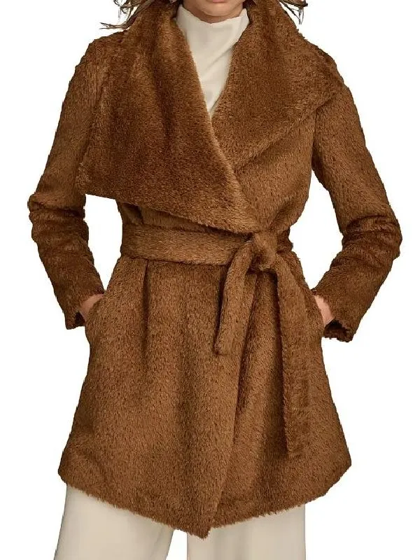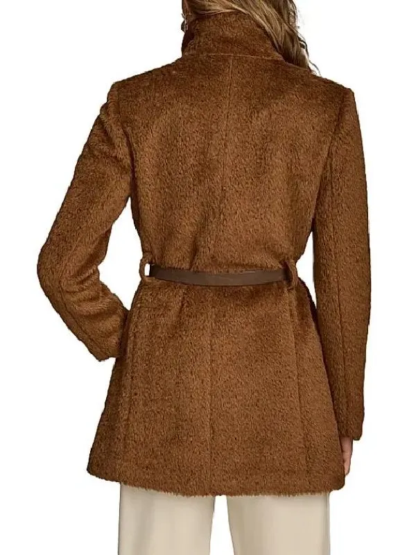 Constructed from fur fabric, ensures durability alongside a smooth, refined finish. The soft viscose lining inside enhances comfort and guarantees ease of wear throughout the day. It includes a front belted closure that provides an adjustable and flattering fit, paired with an asymmetrical fold over collar that introduces a hint of modern flair. Long sleeves with open hem cuffs allow for relaxed movement, while two exterior pockets and one interior pocket offer convenient storage. Finished in a deep brown tone, the Today Show 2025 Jenna Bush Hager Brown Fur Coat strikes the perfect balance between warmth, elegance, and everyday practicality.