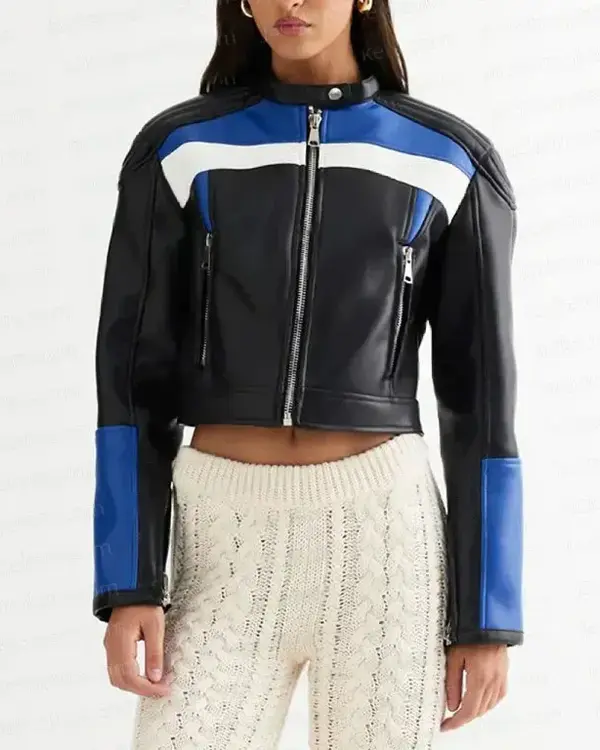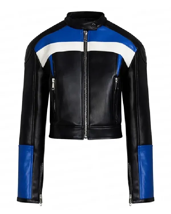 The mix of faux and real leather gives it a premium feel, and the stitching is neat and precise. The bold color combination of black, white, and blue offers a striking contrast, making this jacket a versatile piece. Overall, it’s a well-constructed item that stands out.