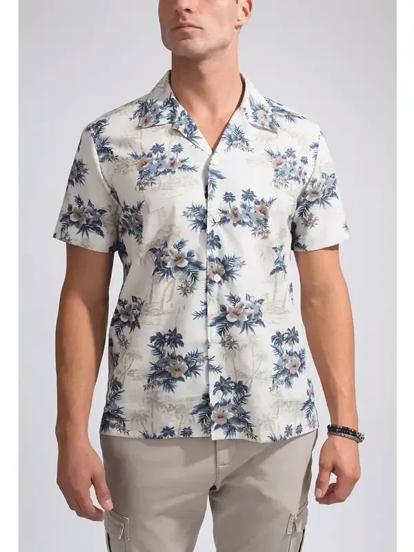This shirt combines a clean, minimalistic look with a bold floral print, making it versatile for different occasions. The soft cotton material provides comfort while maintaining a stylish, casual appeal. Ideal for both laid-back and slightly dressier settings.