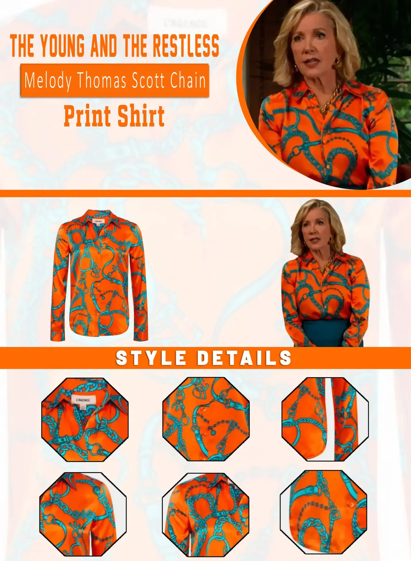 Nikki Reed Newman The Young and the Restless Melody Thomas Scott Orange Satin Chain Print Shirt