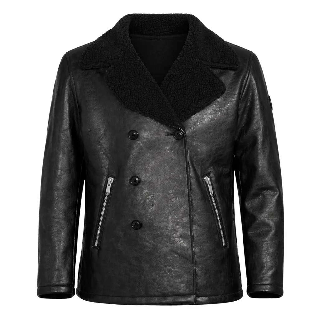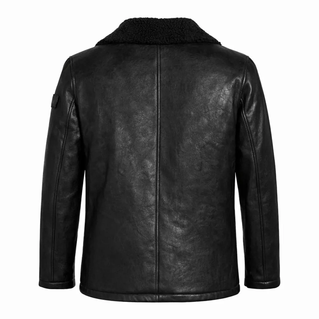 Because this jacket is made of premium real leather or faux leather, customers can select the material that best suits their tastes. It is perfect for colder weather because of the inner shearling lining, which offers additional warmth and comfort. Its lapel-style collar gives the overall design a timeless and striking touch. Its traditional appearance is enhanced by the front buttoned closure, which also provides a snug fit. Complete coverage is offered by full-length sleeves, and a relaxed and cozy finish is provided by open hem cuffs. Additionally, the jacket has two front zipper pockets that are ideal for keeping necessities close at hand. Its black hue makes it incredibly adaptable and simple to wear with casual pants, boots, or jeans. This jacket is appropriate for winter styling, evening events, and everyday wear. It is a fantastic addition to any wardrobe for people who want a self-assured and classic appearance because of its robust design and cozy feel.