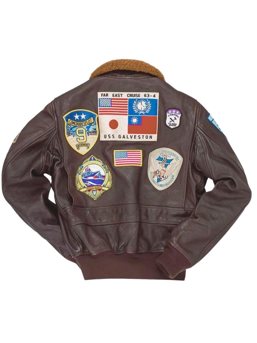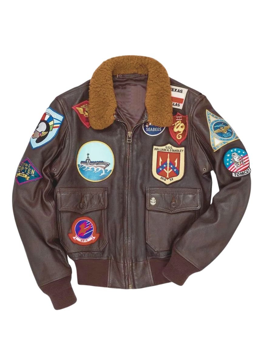 Tom Cruise G1 Brown Leather Jacket is manufactured of Real leather material. Further, the inner viscose lining provides great warmth and relaxation in the wintry breeze. This Top Gun Jacket loaded with the various multi-colored badges and logos consist of several highlighted features such as the shirt collar style with fur, zipper closure front, two flap pockets, full sleeves knitted cuffs and rib-knitted hemline. Hence, the features of the Tom Cruise jacket are stitched in premium quality.