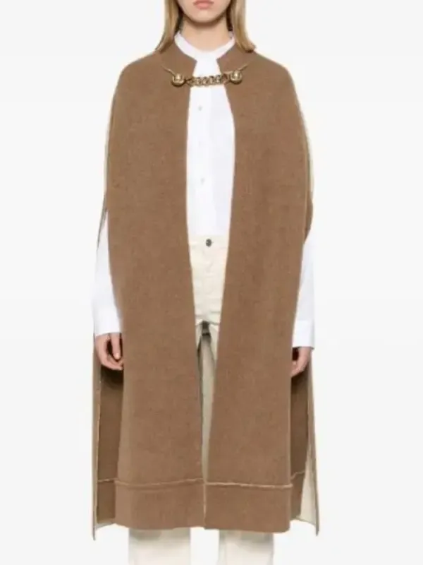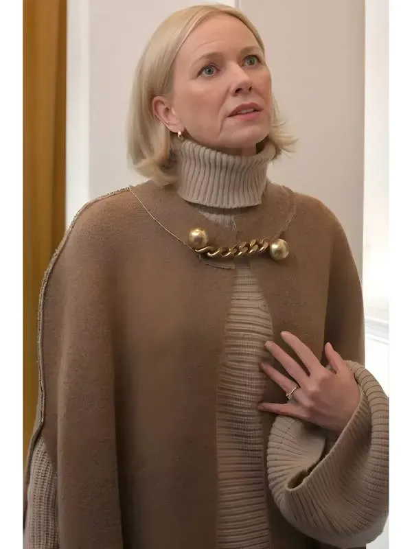 Too Much S01: The TV Series Starring Ann Ratigan The Naomi Watts Brown Chain-Link Wool Cape is made from wool fabric, which adds a stylish edge while offering warmth and softness. It is easy to wear over dresses or tops because of its open-style front. The round-neck collar adds a classic touch, and the cape-style sleeves offer a distinctive silhouette and graceful movement. Its rich brown color elevates any ensemble with an earthy sophistication, making it ideal for layering or colder climates. Whether you are dressing up for a night out or just want to dress up your everyday ensemble, this cape adds an extravagant touch reminiscent of Naomi Watts’ iconic character.