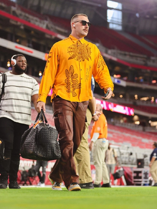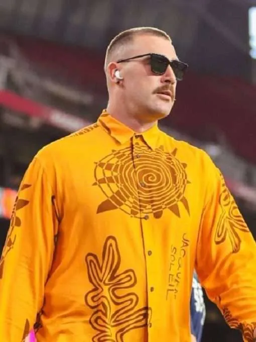 Now you can steal the spotlight even when you are showcasing everyday style. Travis Kelce Sun Print Shirt is a fascinating blend of class and trend. The orange, brown and sun spiral are combined in a stunning combination. The dashing outfit of Travis Kelce in Phoenix’s State Farm Stadium inspired this iconic clothing. This savage wardrobe is complemented by brown leather pants and retro sneakers.