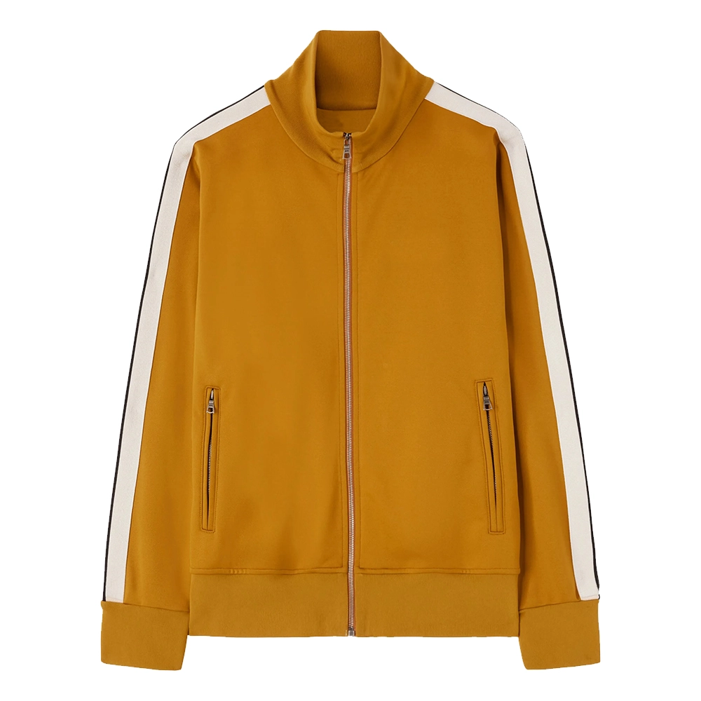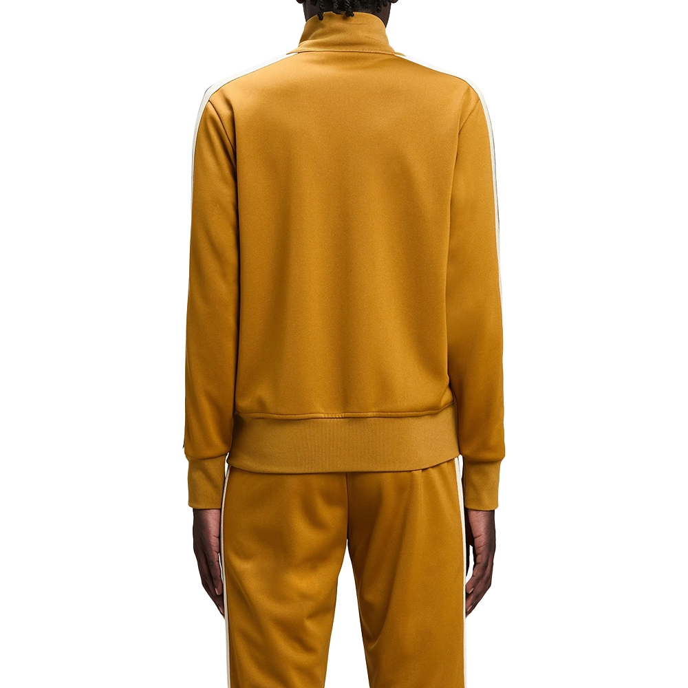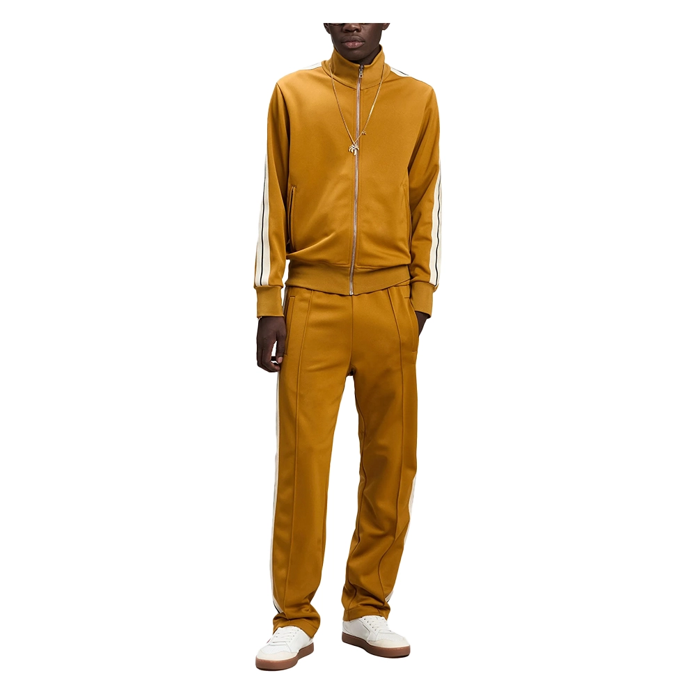 Travis Kelce Palm Angels tracksuit where the fitted pants are made from the same polyester material. The zip fly and button closure along with the jacket enable a snug fit. The trousers also feature two side confers and two back pockets for storage accessibility. The added tones of mustard yellow being the same as the jacket bring a sense of cohesion while standing out when going to the gym or even game. Whether you’re a Travis Kelce fan or just appreciate beautifully made clothes,