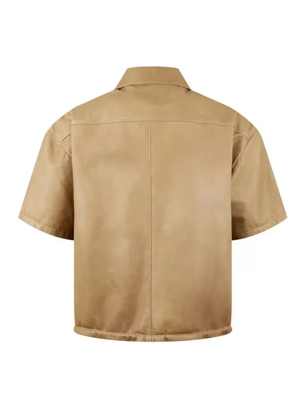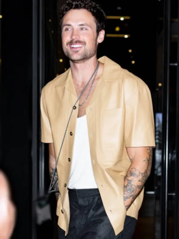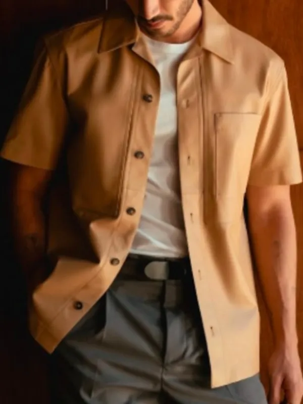 Watch What Happens Live 2025 Dylan Efron Leather Shirt is made using either real or faux leather, with both options offering a soft finish and lasting shape. The fabric is worked with care to keep it smooth while allowing natural movement. The short sleeves are set in a way that avoids extra bulk, and the collar is placed with flat seams for a clear, even line around the neck. The pocket sits gently on the chest, offering light function without drawing too much attention. The beige color blends with many shades, working with both denim and softer fabrics. Though simple in design, the shirt is built to hold its form and serve through repeated wear. Each element is arranged for balance, not excess, making it a quiet staple for those who like calm tones and smooth fabric. The final result is steady, clean, and softly styled.