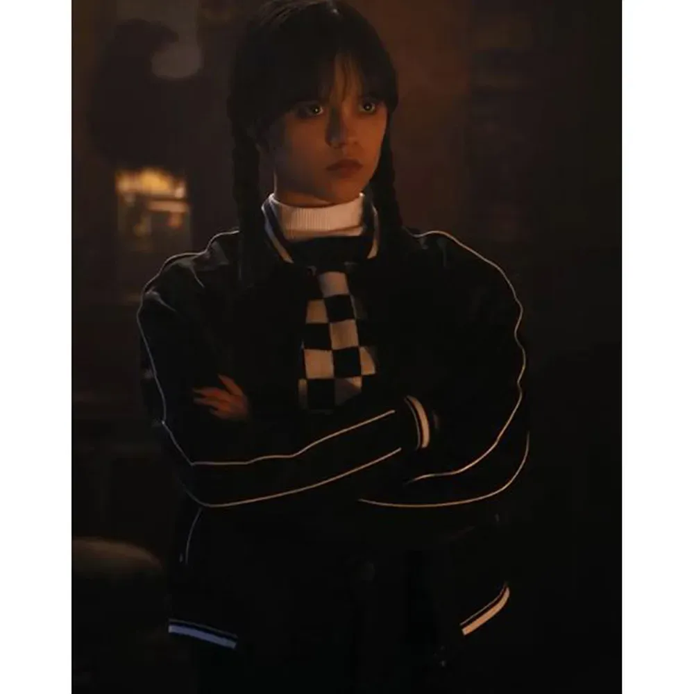 With Jenna Ortega, experience the style and eerie vibes of the Wednesday Addams jacket from the Wednesday television series. It is the ideal item of apparel for anyone interested in a variety of fashion trends. It is unisex and features a gothic design that is enhanced by contemporary elements. The Jenna Ortega Bomber Jacket has been meticulously crafted with fine stitching to ensure longevity and superior quality.