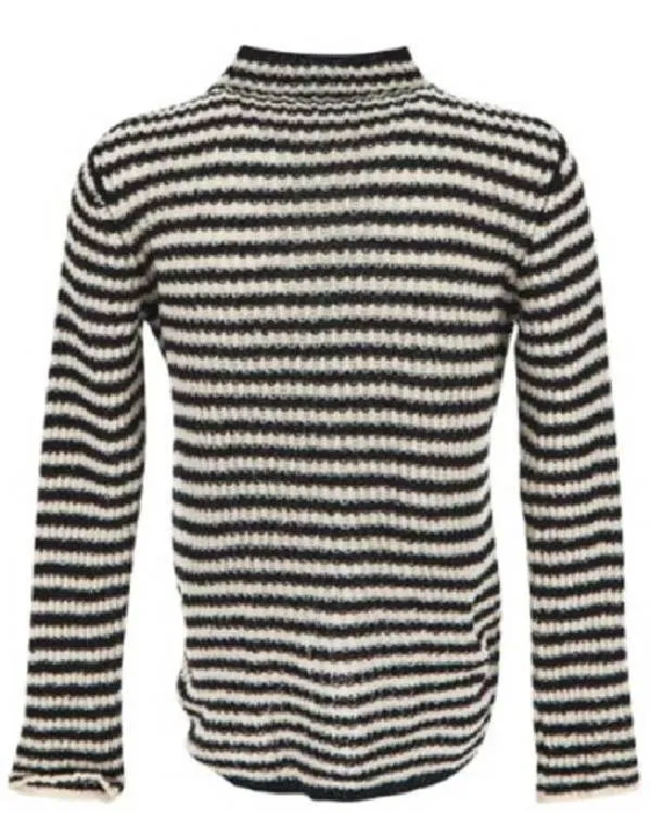 black and white stripes create a classic yet modern look, while the high-neck collar gives it an extra touch of coziness.