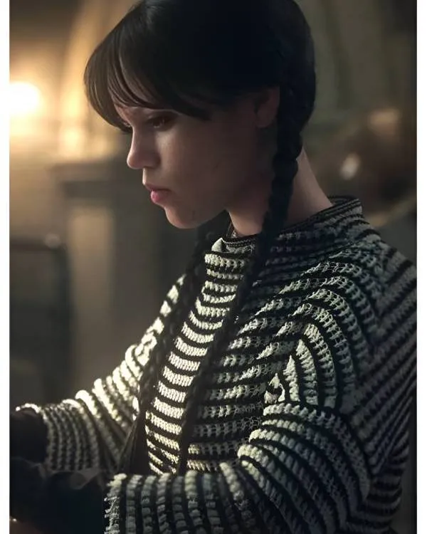Jenna Ortega is a fashion icon thanks to her unique and bold style. Her captivating portrayal of Wednesday Addams in Wednesday is what made her most famous. In Season 2, her character keeps making bold fashion choices; one item that stands out in particular is the Wednesday S02 Striped Sweater. In addition to enhancing her air of mystery and coolness, the jumper represents her ability to blend comfort and style. Fans of the show have been raving about this look, so anyone hoping to incorporate a little Wednesday’s gothic elegance into their wardrobe has to have it.