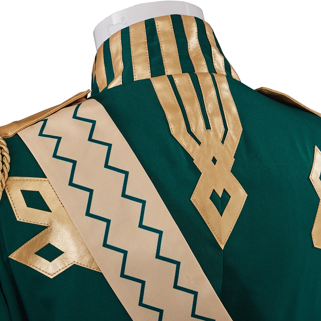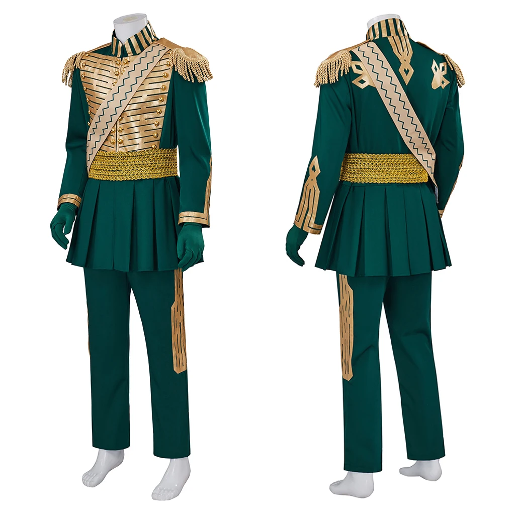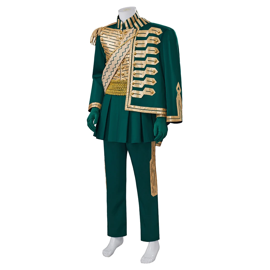 This Wicked For Good Fiyero Costume is crafted with a luxurious, regal aesthetic—perfect for stage performances, band shows, and ceremonial events. The emerald green base paired with rich golden embroidery creates a powerful and sophisticated appearance. The costume features detailed gold patterns, brass buttons, a royal shoulder cape, and a premium decorative sash across the chest. Designed with high-quality fabric and a smooth inner lining, the uniform ensures comfort along with a polished, commanding look.
