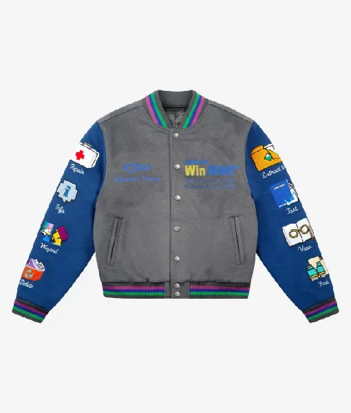 The jacket retains its genuine varsity appeal while offering useful functionality thanks to its classic buttoned front closure. The tight fit and classic athletic style are further enhanced by the rib-knit collar, cuffs, and hemline. Its striking gray and blue color scheme is the ideal balance of understated elegance and striking style, making it adaptable enough to pair with a wide range of ensembles. The WinRAR Varsity Jacket is great in every way, whether you are looking for a versatile piece to update your wardrobe or you like vintage letterman style. The excellent craftsmanship guarantees that it will continue to be a favorite for many seasons to come, and the tailored fit produces a figure-flattering effect.