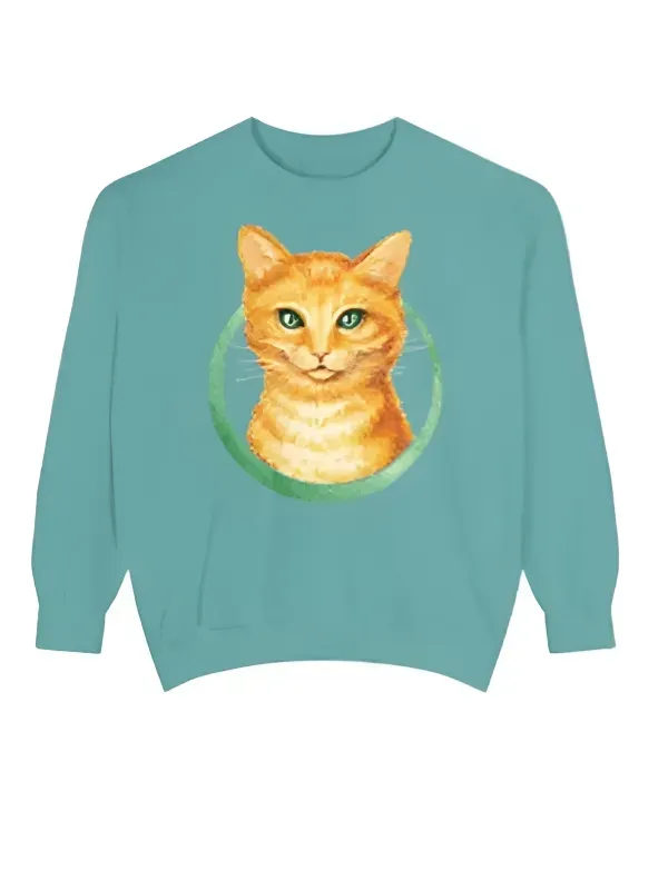 The round neck collar and rib-knitted cuffs give the sweater a snug and comfortable fit. The long sleeves provide ample coverage, while the cat face graphic on the front brings a whimsical touch to the overall look. Simple yet distinctive features that stand out.