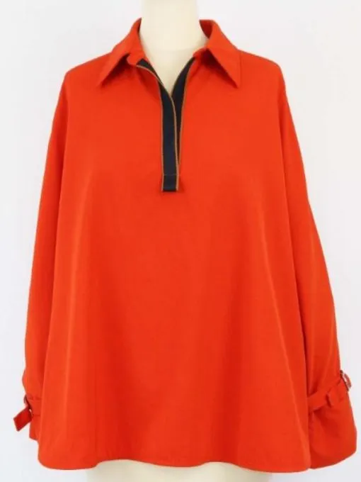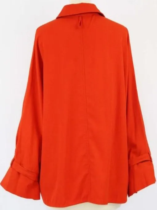 The Yes Chef S01 Martha Stewart orange pullover top is made of silk, which is smooth and luxurious, giving it a glossy, soft finish. Its classic shirt collar adds a touch of sophistication. The full-length sleeves’ round cuffs have a stylish belted detail that adds uniqueness and sophistication to the design. The striking orange color creates a striking and fashionable look that is perfect for creating a statement when combined with black trim. This pullover top is ideal for anyone wishing to add a striking yet sophisticated piece to their wardrobe because it was inspired by a strong and stylish figure.